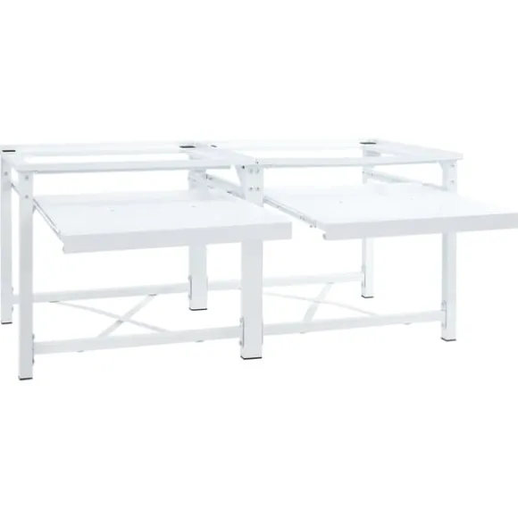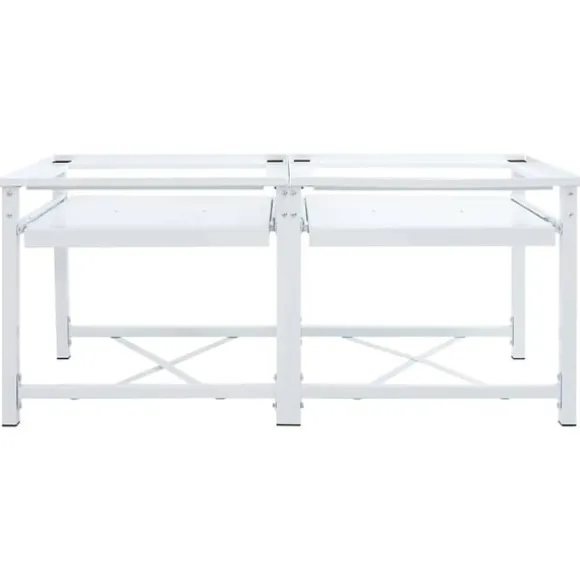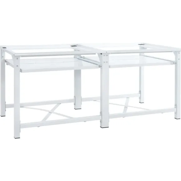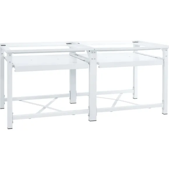 Denna tvättmaskinspiedestal med utdragbara hyllor är utformad för att hålla apparater som tvättmaskiner från golvet och höja dem till en mer lämplig arbetshöjd.