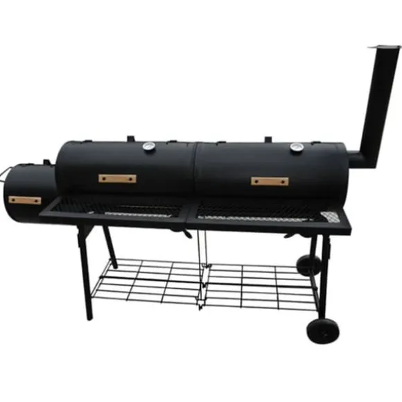 Denna rökgrill är en kombination av en traditionell grill och en rökgrill. Du kan använda den till att grilla, röka, rosta och hålla maten varm. I eldfacket producerar träet värme och rök som sprids jämnt inuti rökgrillen. Om du håller dig till ett sätt att laga mat kan den separata eldlådan användas för att hålla värmen på din redan grillade mat.