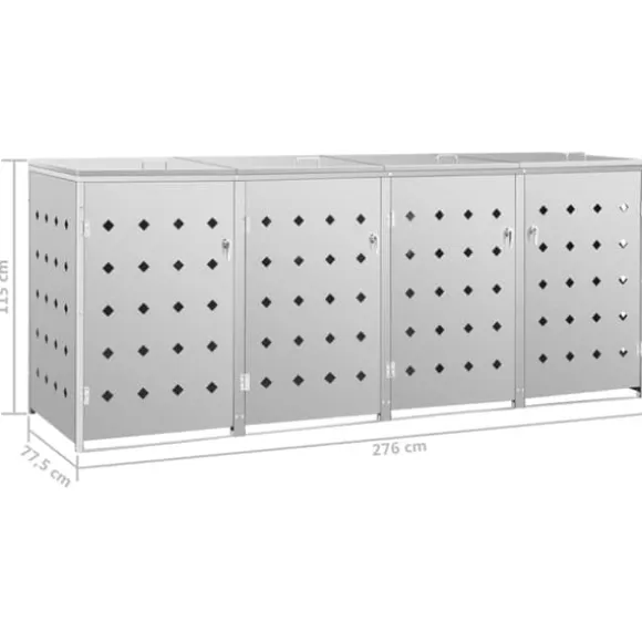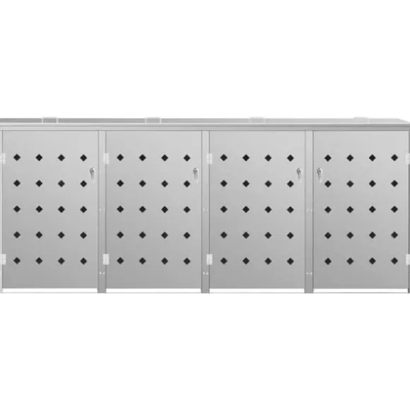 Skjulet för sopkärl är tillverkat av rostfritt stål och är ytterst väderbeständigt och hållbart. De praktiska ventilationshålen möjliggör luftcirkulation och förhindrar otrevliga lukter i skjulet, medan låssystemet gör att soporna förvaras säkert. Dessutom låter den praktiska dörren dig att enkelt sätta in och ta ut sopkärlet.