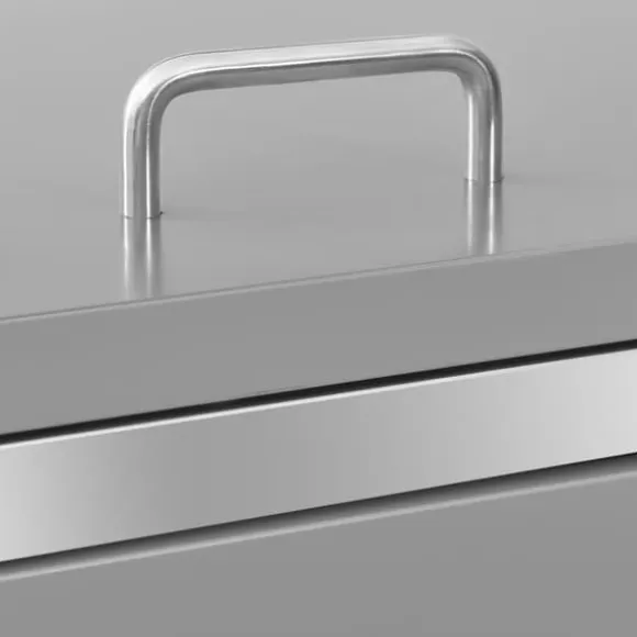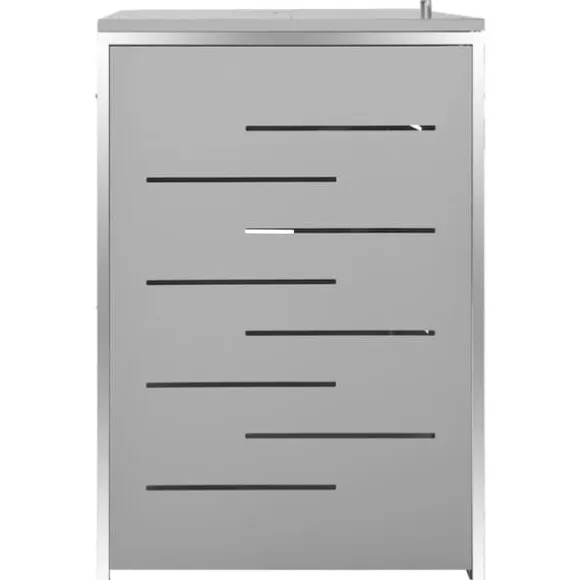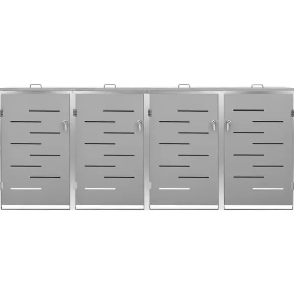 Sopskjulet är tillverkat av galvaniserade stålpaneler och en ram av rostfritt stål, vilket gör det mycket robust och rostbeständigt. Den ihåliga designen släpper in luft och förhindrar otrevliga lukter, medan låset säkerställer säker förvaring av soporna. Dessutom gör det praktiska locket och fjädrarna det enkelt att ta ut och sätta in sopkärlet.