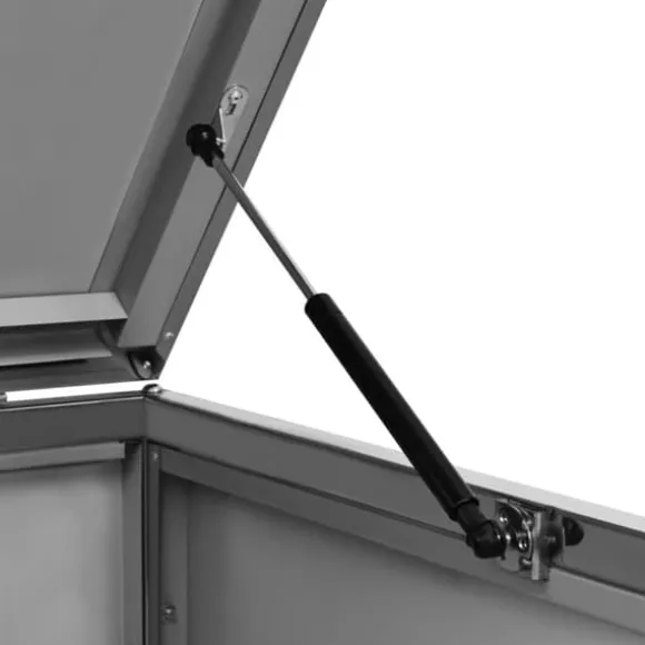 Sopskjulet är tillverkat av galvaniserade stålpaneler och en ram av rostfritt stål, vilket gör det mycket robust och rostbeständigt. Den ihåliga designen släpper in luft och förhindrar otrevliga lukter, medan låset säkerställer säker förvaring av soporna. Dessutom gör det praktiska locket och fjädrarna det enkelt att ta ut och sätta in sopkärlet.