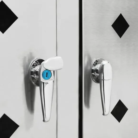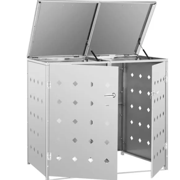 Skjulet för sopkärl är tillverkat av rostfritt stål och är ytterst väderbeständigt och hållbart. De praktiska ventilationshålen möjliggör luftcirkulation och förhindrar otrevliga lukter i skjulet, medan låssystemet gör att soporna förvaras säkert. Dessutom låter den praktiska dörren dig att enkelt sätta in och ta ut sopkärlet.