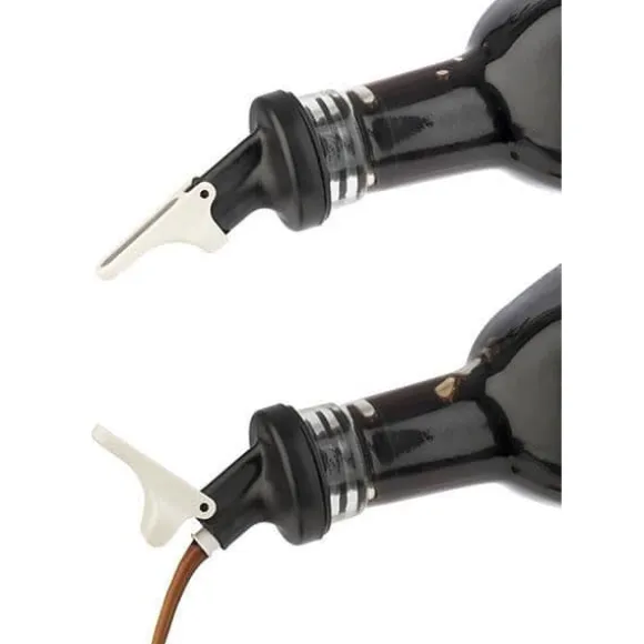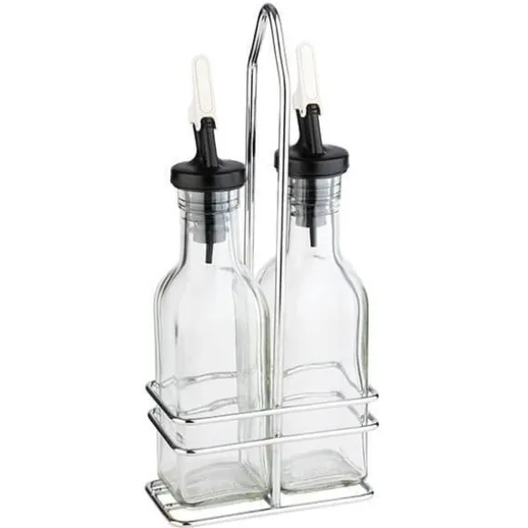 Olja och vinäger bestickset i kromad metall. 120 ml eller 500 ml glasbehållare, polypropen och ABS, silikon och rostfria lock. Antidropppip. Tål inte diskmaskin.