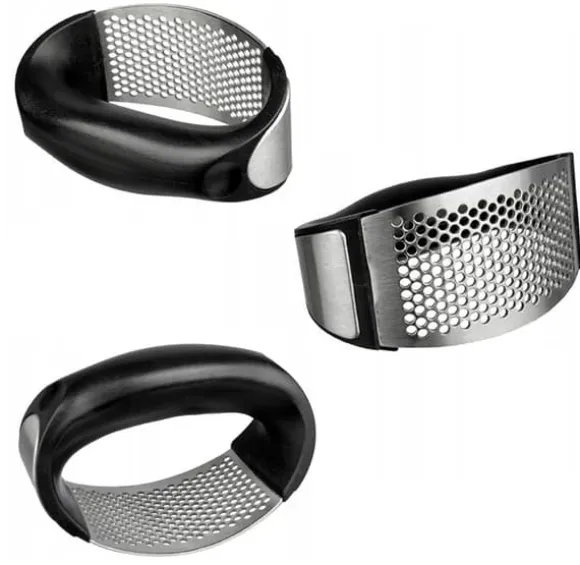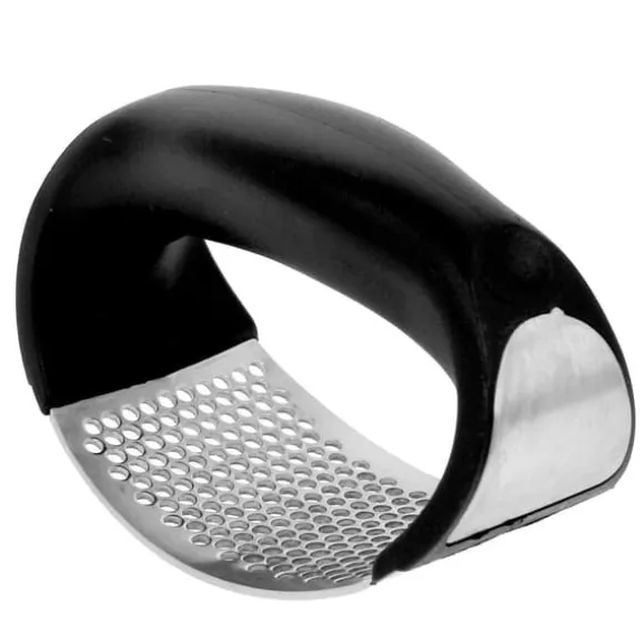 Vitlökspress/kross i rostfritt stål med plasthandtag.