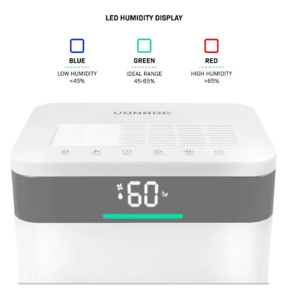 De färgkodade LED-lamporna visar aktuell luftfuktighet: