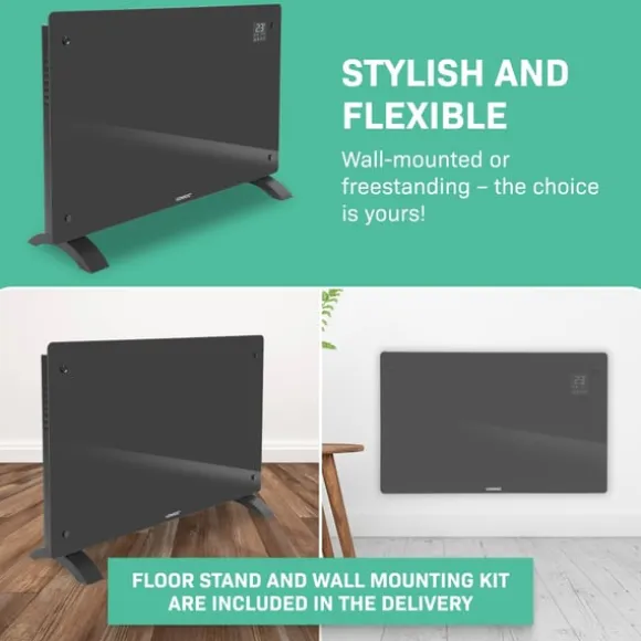 Effekten på 2000W ger tillräckligt med kraft för att värma utrymmen på upp till 24 m2 . De praktiska måtten (78 x 47 cm) gör den här enheten lätt att flytta så du kan värma upp vilket önskat rum som helst på nolltid. Det är perfekt när du arbetar hemifrån och inte vill ha centralvärme igång hela dagen. Vill du hellre montera elementet på väggen? Inga problem. Vi skickar med ett golvstativ samt en monteringssats. Vi lämnar valet upp till dig!