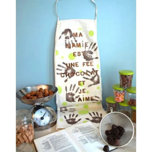 Köksförkläde Det här köks- eller arbetsförklädet är off-white. I vuxenstorlek (90 x 60 cm) består det av en snodd för nacke, en snodd för midjeanslutning och en liten framficka. Oumbärlig för alla smutsiga arbeten, från målning till keramik, från tuschpennor till kreativ matlagning!