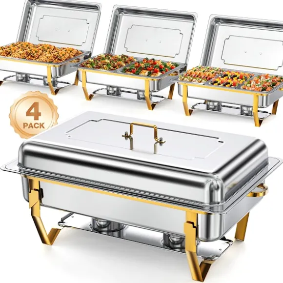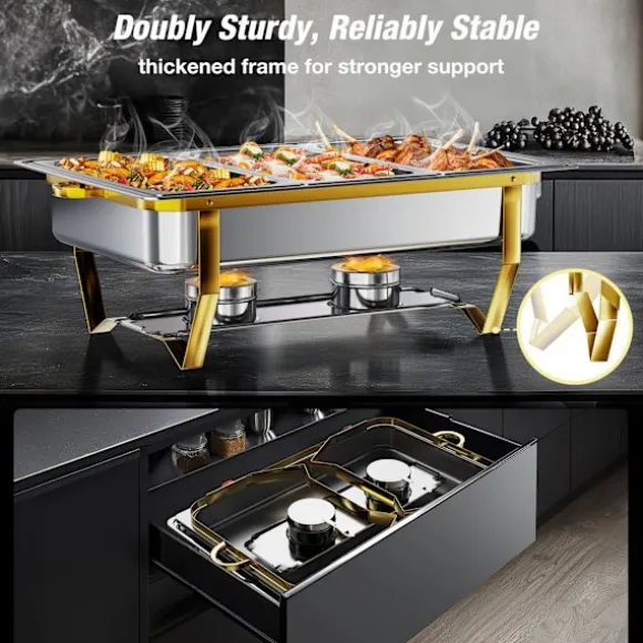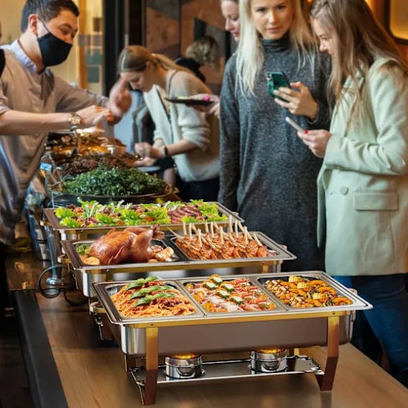Den spegelblanka ytan i rostfritt stål på de guldfärgade varmhållningsskålarna och buffévärmarseten motstår mat som fastnar och är lätta att torka av. Spara tid efter evenemang – diska bara eller diska i diskmaskinen för enkelt underhåll