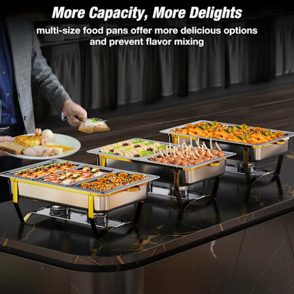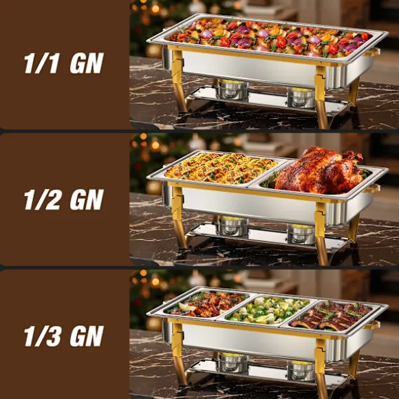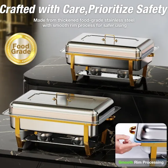 Varmhållningsfat-buffésetet är tillverkat av kraftigt, livsmedelsklassat rostfritt stål som motstår rost, bucklor och slitage för långvarig användning. De rullade kanterna på varmhållningsskålarna i rostfritt stål erbjuder säker hantering och hjälper till att förhindra oavsiktliga skärskador under uppställning eller service.