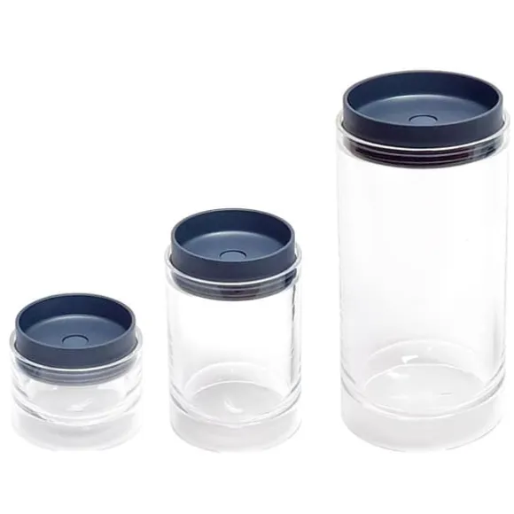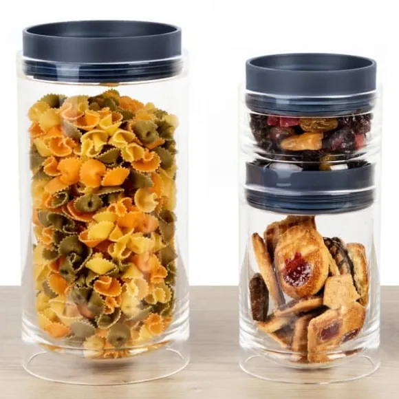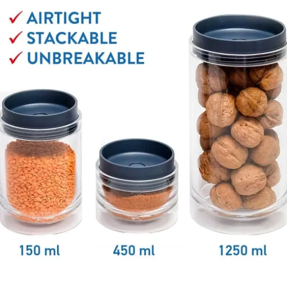 Att förvara exempelvis müsli, mjöl eller socker i tätförslutande burkar är inte bara ett sätt att sätta en mer personlig prägel på ditt kök, det är dessutom ett utmärkt sätt att spara plats och förlänga livslängden på produkterna. Dessa tre burkar kan du stapla på varandra, de två mindre burkarna går till och med att förvara i den större burken när de inte används. De är tillverkade i stark akryl vilket gör att du slipper oroa dig för att de ska gå i kras om de faller ner på golvet.