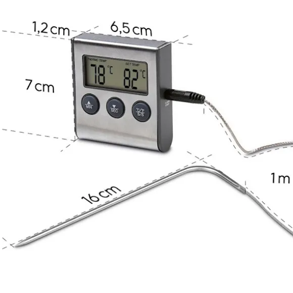 Den här digitala köttermometern är ett viktigt verktyg för alla som vill uppnå perfekta matlagningsresultat utan att behöva gissa. Den har ett hörbart larm som varnar dig när tillagningstiden är slut, vilket gör den perfekt för kött, grönsaker och mycket mer. Proben i rostfritt stål, som mäter 160 mm, levereras med en 1 meter lång värmebeständig kabel, så att du kan mäta kärntemperaturen i din mat exakt.