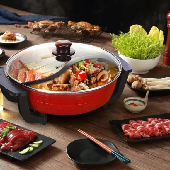 Elektrisk Yuanyang Hot Pot med dubbelkammare – 6 l för två smaker samtidigtNjut av äkta hot pot hemma. Denna 1300W multikokare med tvådelad gryta låter dig laga starkt och milt på en gång. Robust konstruktion i rostfritt stål, lätt att rengöra och med smidig temperaturkontroll – i en stilren röd finish.