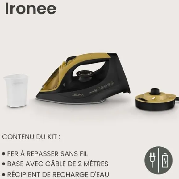 Upptäck ZEEGMA Ironee, det trådlösa strykjärnet. Med en kraft på 2600 W erbjuder det en horisontell och vertikal ångspray för effektiv strykning. Dess keramiska sula och sitt kalkskyddssystem garanterar en perfekt glidning och optimal hållbarhet. Njut av ett trådlöst strykande utan begränsningar tack vare sin trådlösa funktion.
